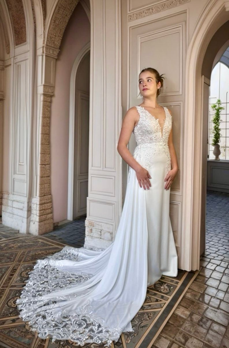 Sa traîne amovible en dentelle, proposée en option à 150 €, ajoute une note de romantisme et de majesté pour la cérémonie.