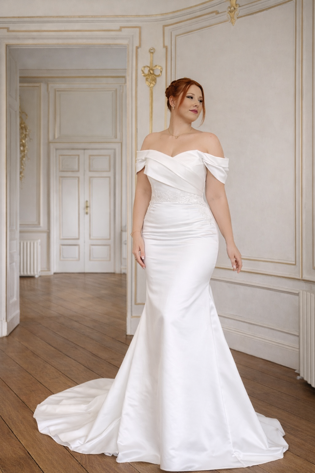 Une création idéale pour la mariée en quête d’une robe élégante, structurée et résolument raffinée.