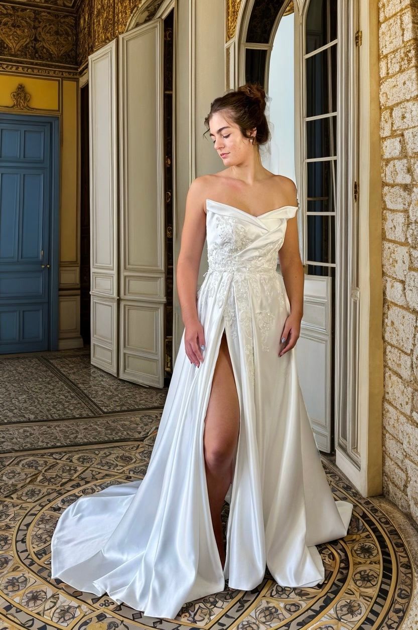 La robe Maeylis est une création pensée pour une mariée audacieuse, élégante et lumineuse, sûre de son style et de sa féminité.