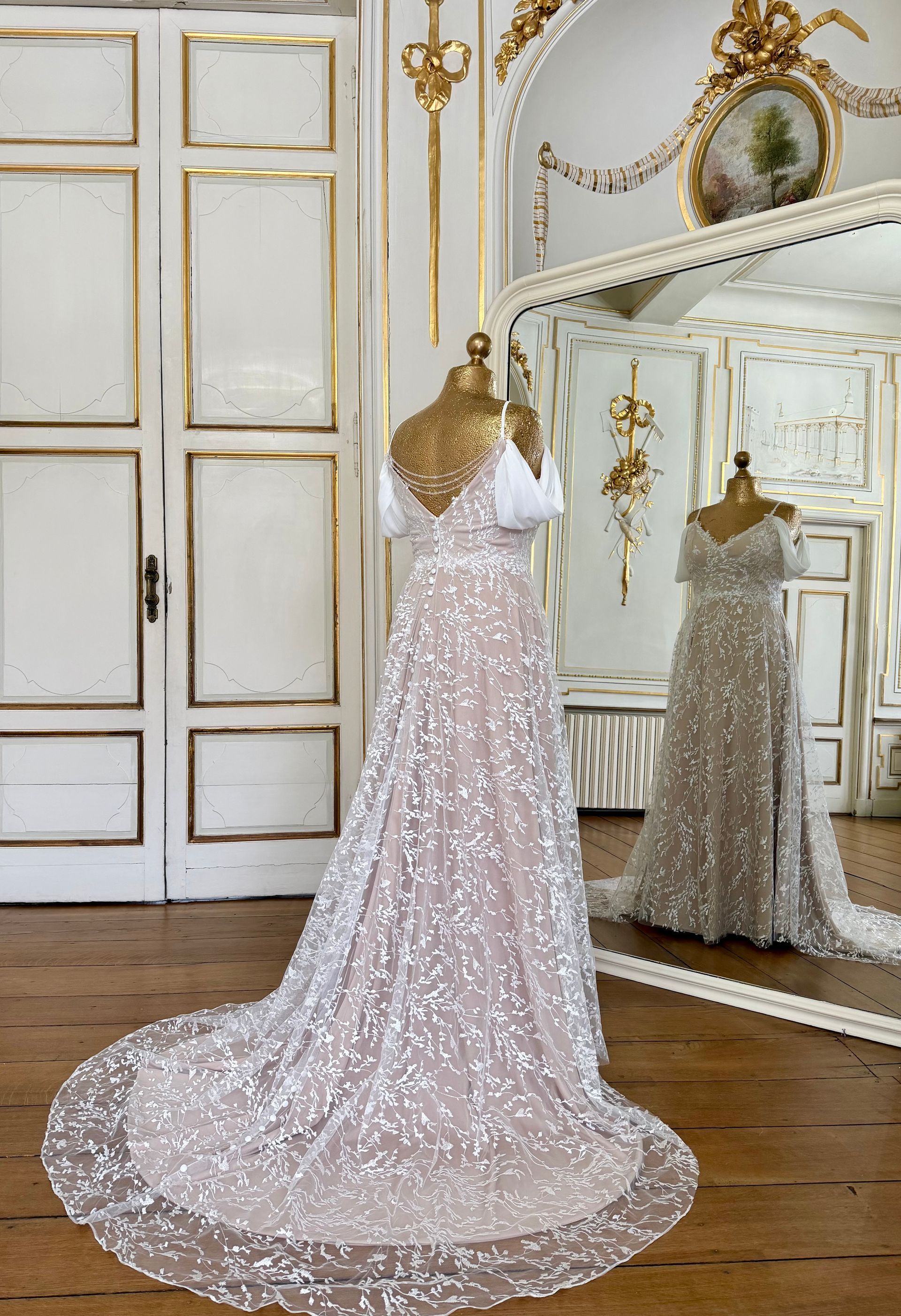 Sa dentelle florale habille la robe avec poésie et romantisme, évoquant l’esprit bucolique des mariages en pleine nature. La traîne délicate vient sublimer l’ensemble, ajoutant une touche majestueuse tout en conservant une allure fluide et harmonieuse.