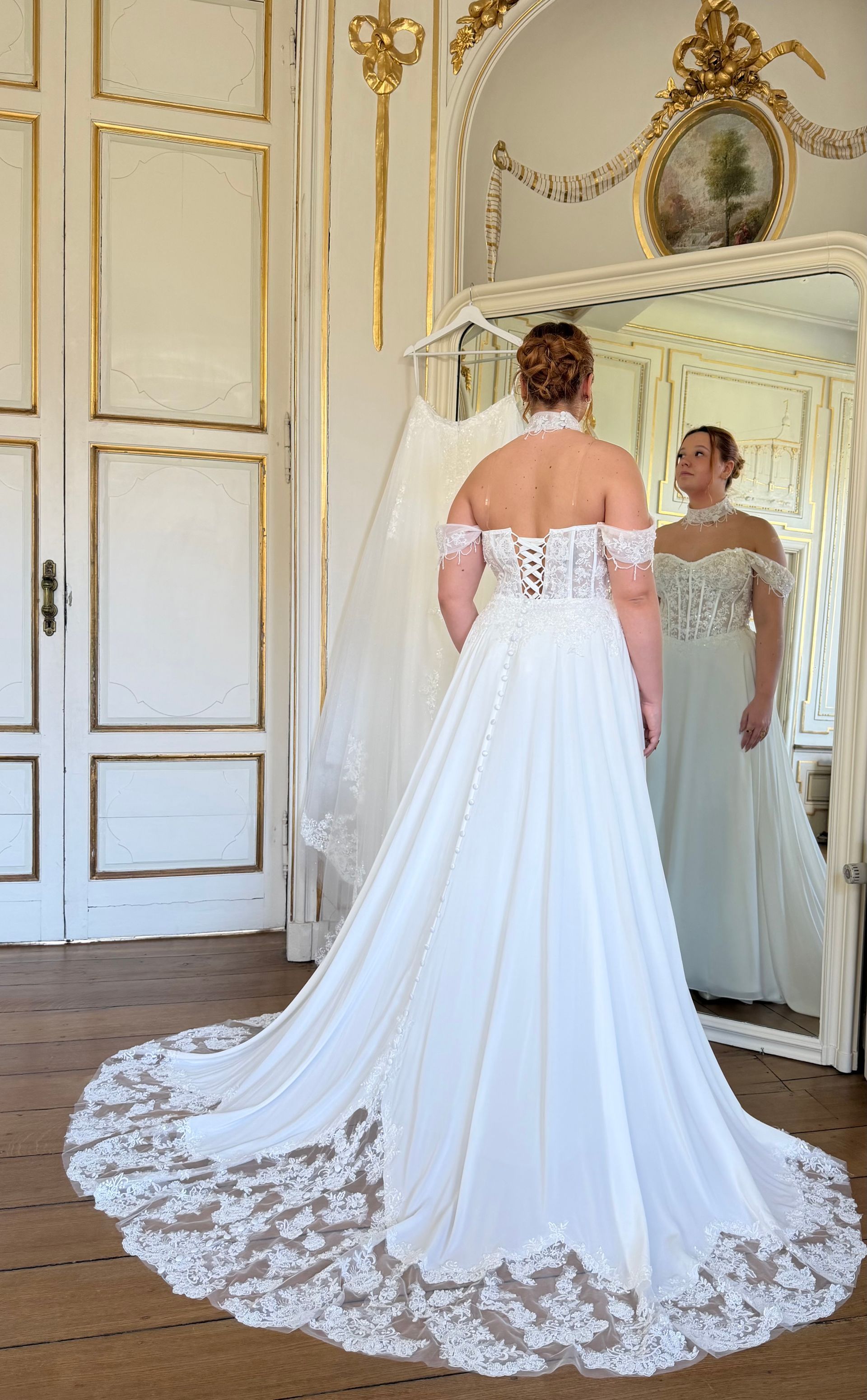 - Pour la cérémonie laïque ou la commune : une traîne amovible en mousseline et dentelle, proposée en option, qui apporte élégance et poésie.