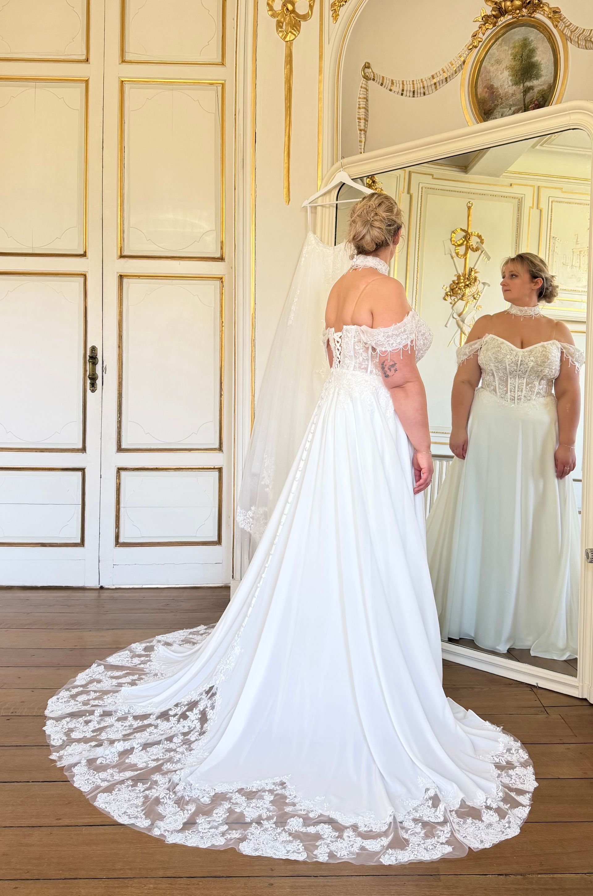 - Pour la cérémonie laïque ou la commune : une traîne amovible en mousseline et dentelle, proposée en option, qui apporte élégance et poésie.