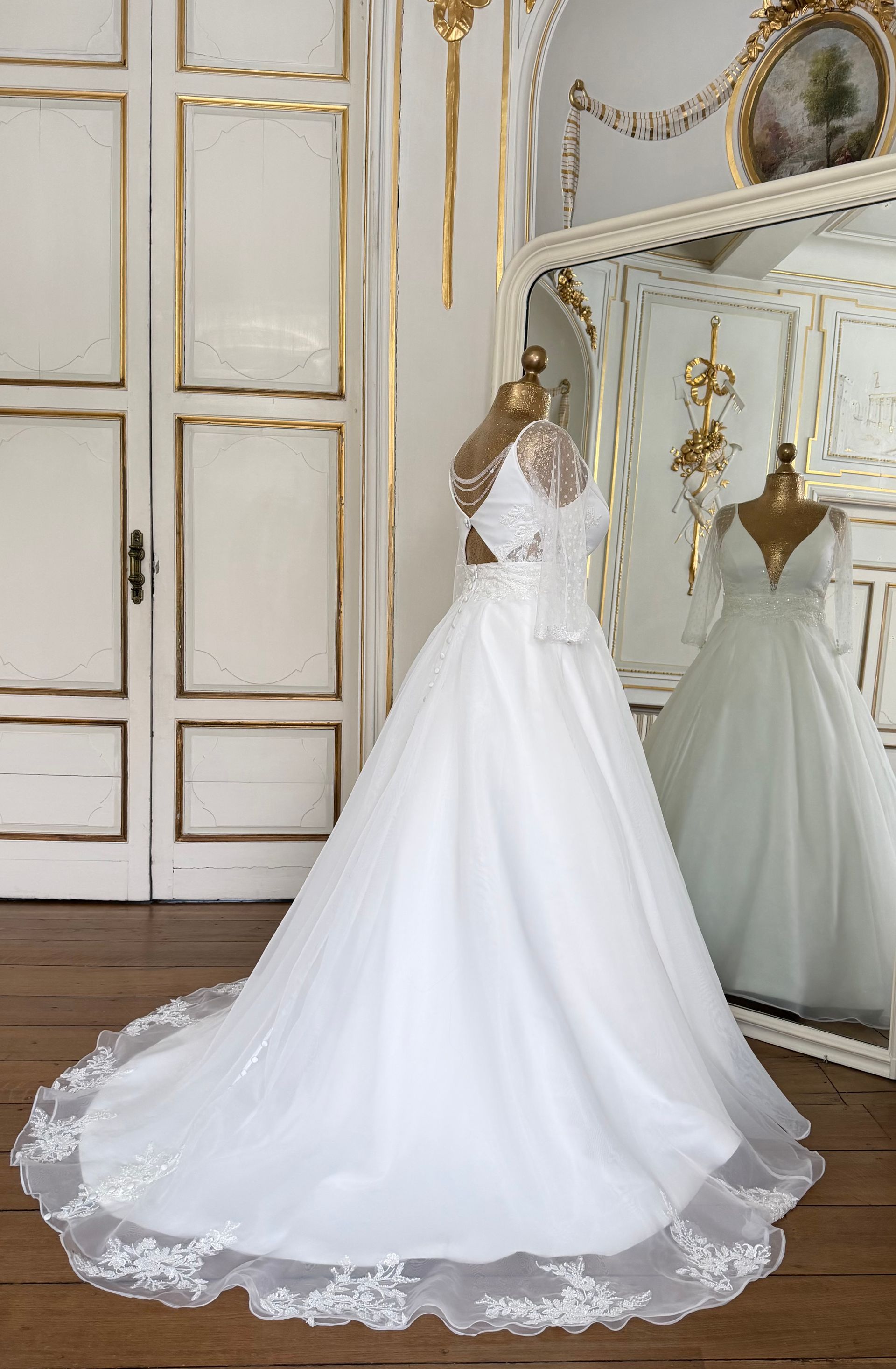 À la tombée de la nuit, la robe se transforme : la jupe princesse laisse place à une jupe en satin léger, fluide et raffinée, parfaite pour danser et profiter pleinement de la soirée. Cette version plus épurée sublime la silhouette tout en garantissant confort et liberté de mouvement.